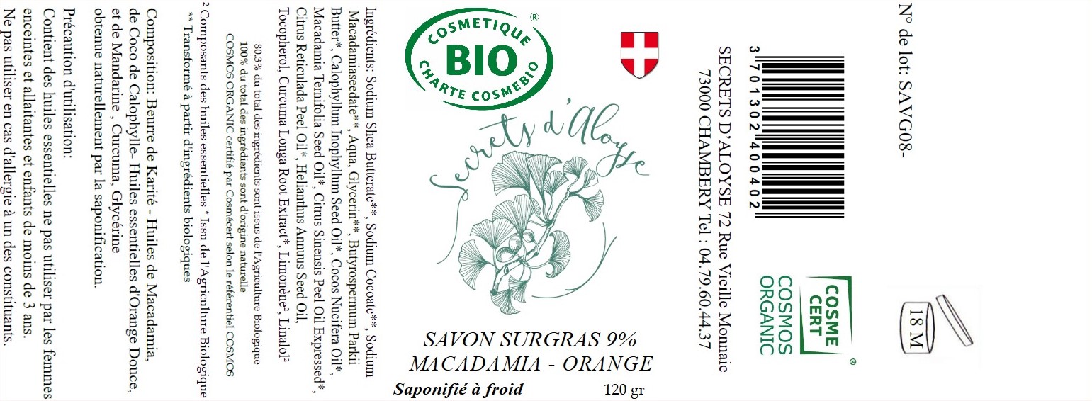 Sodium Shea Butterate**, Sodium Cocoate**, Sodium Macadamiaseedate**, Aqua, Glycerin**, Butyrospermum Parkii Butter*, Calophyllum Inophyllum Seed Oil*, Cocos Nucifera Oil*, Macadamia Ternifolia Seed Oil*, Citrus Sinensis Peel Oil Expressed*, Citrus Reticulada Peel Oil*, Helianthus Annuus Seed Oil, Tocopherol, Curcuma Longa Root Extract*, Limonène², Linalol²