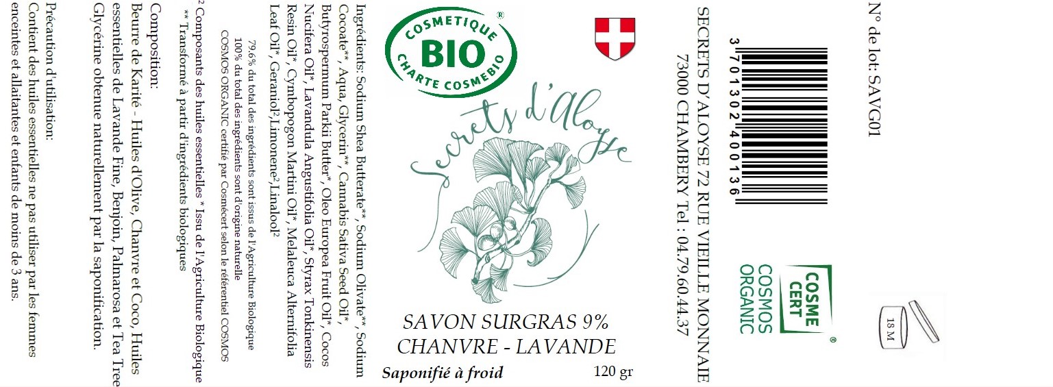 Sodium Shea Butterate**, Sodium Olivate**, Sodium Cocoate**, Aqua, Glycerin**, Cannabis Sativa Seed Oil*, Butyrospermum Parkii Butter*, Oleo Europea Fruit Oil*, Cocos Nucifera Oil*, Lavandula Angustifolia Oil*, Styrax Tonkinensis Resin Oil*, Cymbopogon Martini Oil*, Melaleuca Alternifolia Leaf Oil*, Geraniol²,Limonene²,Linalool²