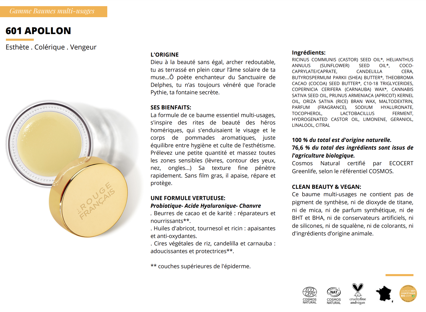 RICINUS COMMUNIS (CASTOR) SEED OIL*, HELIANTHUS ANNUUS (SUNFLOWER) SEED OIL*, COCOCAPRYLATE/CAPRATE, CANDELILLA CERA, BUTYROSPERMUM PARKII (SHEA) BUTTER*, THEOBROMA CACAO (COCOA) SEED BUTTER*, C10-18 TRIGLYCERIDES, COPERNICIA CERIFERA (CARNAUBA) WAX*, CANNABIS SATIVA SEED OIL, PRUNUS ARMENIACA (APRICOT) KERNEL OIL, ORIZA SATIVA (RICE) BRAN WAX, MALTODEXTRIN, PARFUM (FRAGRANCE), SODIUM HYALURONATE, TOCOPHEROL, LACTOBACILLUS FERMENT, HYDROGENATED CASTOR OIL, LIMONENE, GERANIOL, LINALOOL, CITRAL