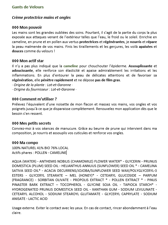 aqua (water) – anthemis nobilis (chamomile) flower water* – glycerin – prunus domestica (plum) seed oil – helianthus annuus (sunflower) seed oil * – camelina sativa seed oil* – acacia decurrens/jojoba/sunflower seed wax/polyglyceryl-3 esters – glyceryl stearate – mel (honey)* – cetearyl glucoside – parfum (fragrance) – sorbitan olivate – propolis extract * – pollen extract * – pinus pinaster bark extract – tocopherol – glycine soja oil – tapioca starch* – hydrogenated prunus domestica seed oil – xanthan gum – sodium levulinate – cetearyl alcohol – sodium stearoyl glutamate – glyceryl caprylate – sodium anisate – lactic acid