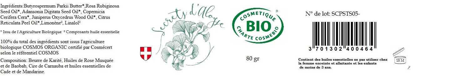 Butyrospermum Parkii Butter*,Rosa Rubiginosa Seed Oil*, Adansonia Digitata Seed Oil*, Copernicia Cerifera Cera*, Juniperus Oxycedrus Wood Oil*, Citrus Reticulata Peel Oil*,Limonène², Linalol²
