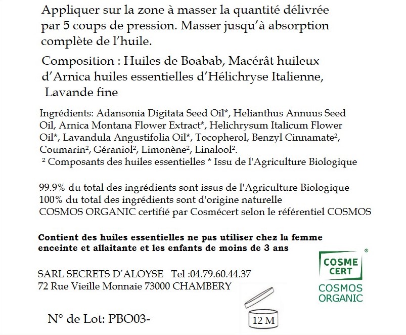 Adansonia Digitata Seed Oil*,Helianthus Annuus Seed Oil, Arnica Montana Flower Extract*, Helichrysum Italicum Flower Oil* Lavandula Angustifolia Oil*, Tocopherol, Benzyl Cinnamate², Coumarin², Géraniol², Limonène², Linalool².