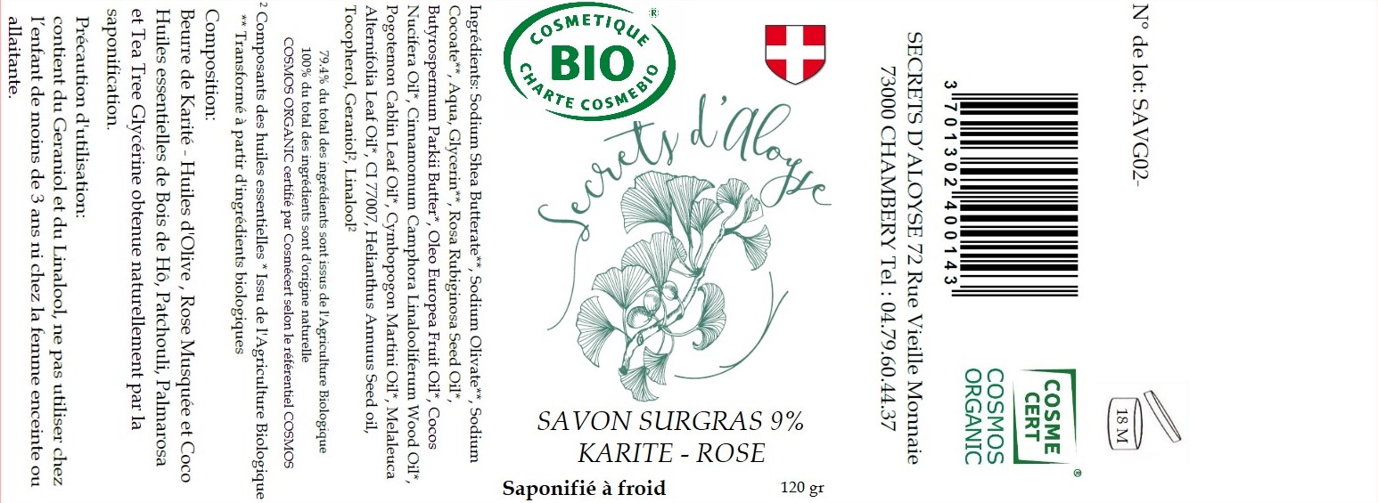 Sodium Shea Butterate**, Sodium Olivate**, Sodium Cocoate**, Aqua, Glycerin**, Rosa Rubiginosa Seed Oil*, Butyrospermum Parkii Butter*, Oleo Europea Fruit Oil*, Cocos Nucifera Oil*, Cinnamomum Camphora Linalooliferum Wood Oil*, Pogotemon Cablin Leaf Oil*, Cymbopogon Martini Oil*, Melaleuca Alternifolia Leaf Oil*, CI 77007, Helianthus Annuus Seed oil, Tocopherol, Geraniol², Linalool²