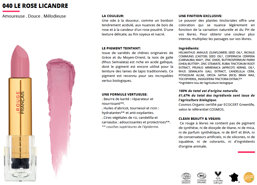 Cosmos organic certifié par ECOCERT Greenlife selon le référentiel COSMOS.
