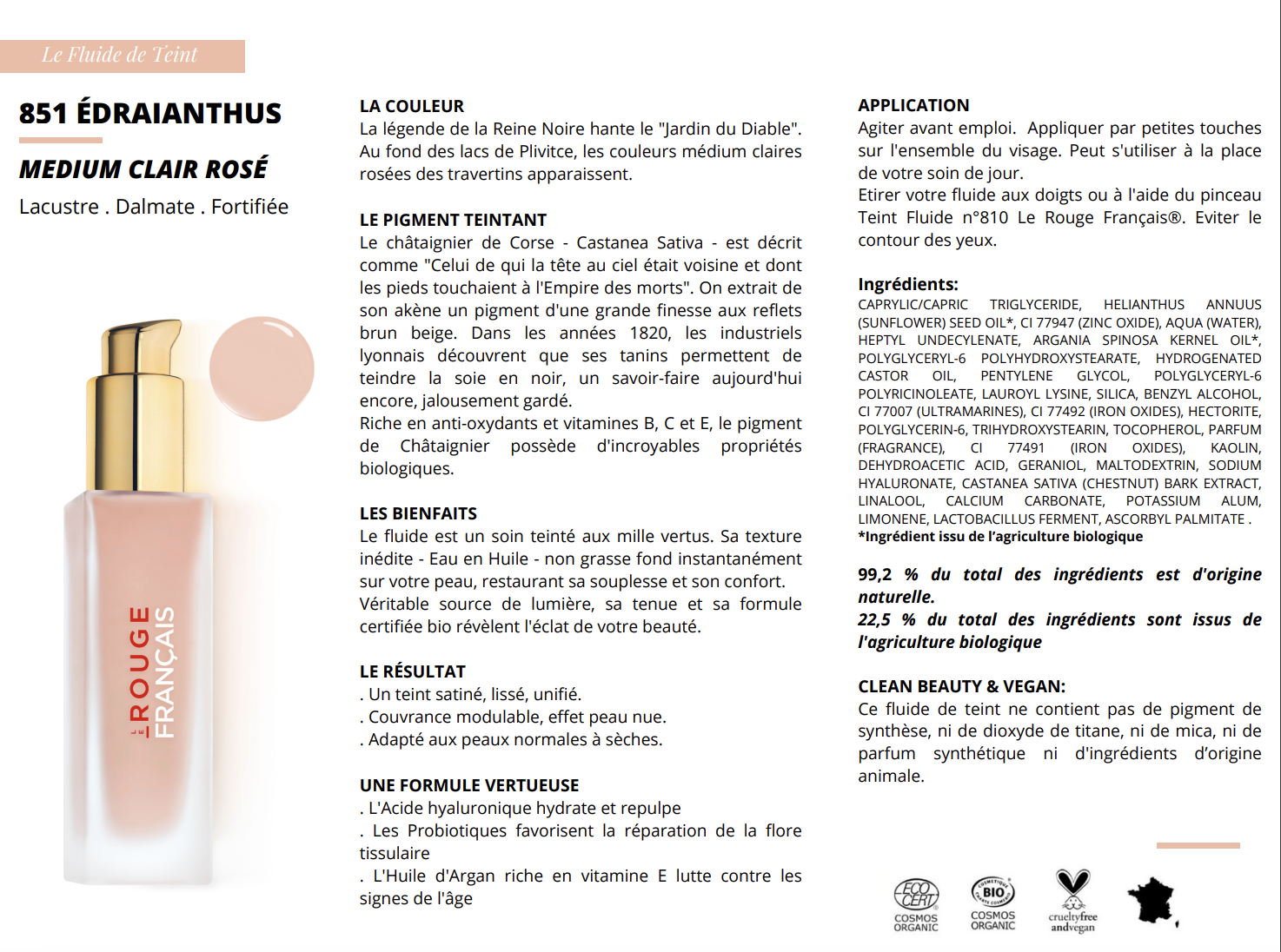 CAPRYLIC/CAPRIC TRIGLYCERIDE, HELIANTHUS ANNUUS (SUNFLOWER) SEED OIL*, CI 77947 (ZINC OXIDE), AQUA (WATER), HEPTYL UNDECYLENATE, ARGANIA SPINOSA KERNEL OIL*, POLYGLYCERYL-6 POLYHYDROXYSTEARATE, HYDROGENATED CASTOR OIL, PENTYLENE GLYCOL, POLYGLYCERYL-6 POLYRICINOLEATE, LAUROYL LYSINE, SILICA, BENZYL ALCOHOL, CI 77007 (ULTRAMARINES), CI 77492 (IRON OXIDES), HECTORITE, POLYGLYCERIN-6, TRIHYDROXYSTEARIN, TOCOPHEROL, PARFUM (FRAGRANCE), CI 77491 (IRON OXIDES), KAOLIN, DEHYDROACETIC ACID, GERANIOL, MALTODEXTRIN, SODIUM HYALURONATE, CASTANEA SATIVA (CHESTNUT) BARK EXTRACT, LINALOOL, CALCIUM CARBONATE, POTASSIUM ALUM, LIMONENE, LACTOBACILLUS FERMENT, ASCORBYL PALMITATE . *Ingrédient issu de l’agriculture biologique