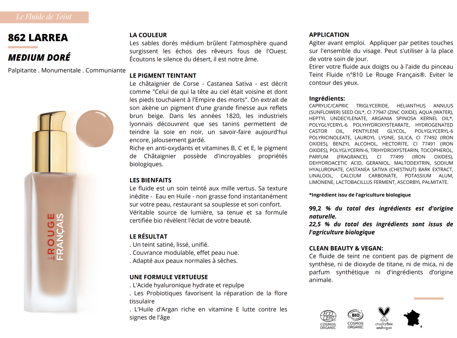 CAPRYLIC/CAPRIC TRIGLYCERIDE, HELIANTHUS ANNUUS (SUNFLOWER) SEED OIL*, CI 77947 (ZINC OXIDE), AQUA (WATER), HEPTYL UNDECYLENATE, ARGANIA SPINOSA KERNEL OIL*, POLYGLYCERYL-6 POLYHYDROXYSTEARATE, HYDROGENATED CASTOR OIL, PENTYLENE GLYCOL, POLYGLYCERYL-6 POLYRICINOLEATE, LAUROYL LYSINE, SILICA, CI 77492 (IRON OXIDES), BENZYL ALCOHOL, HECTORITE, CI 77491 (IRON OXIDES), POLYGLYCERIN-6, TRIHYDROXYSTEARIN, TOCOPHEROL, PARFUM (FRAGRANCE), CI 77499 (IRON OXIDES), DEHYDROACETIC ACID, GERANIOL, MALTODEXTRIN, SODIUM HYALURONATE, CASTANEA SATIVA (CHESTNUT) BARK EXTRACT, LINALOOL, CALCIUM CARBONATE, POTASSIUM ALUM, LIMONENE, LACTOBACILLUS FERMENT, ASCORBYL PALMITATE.