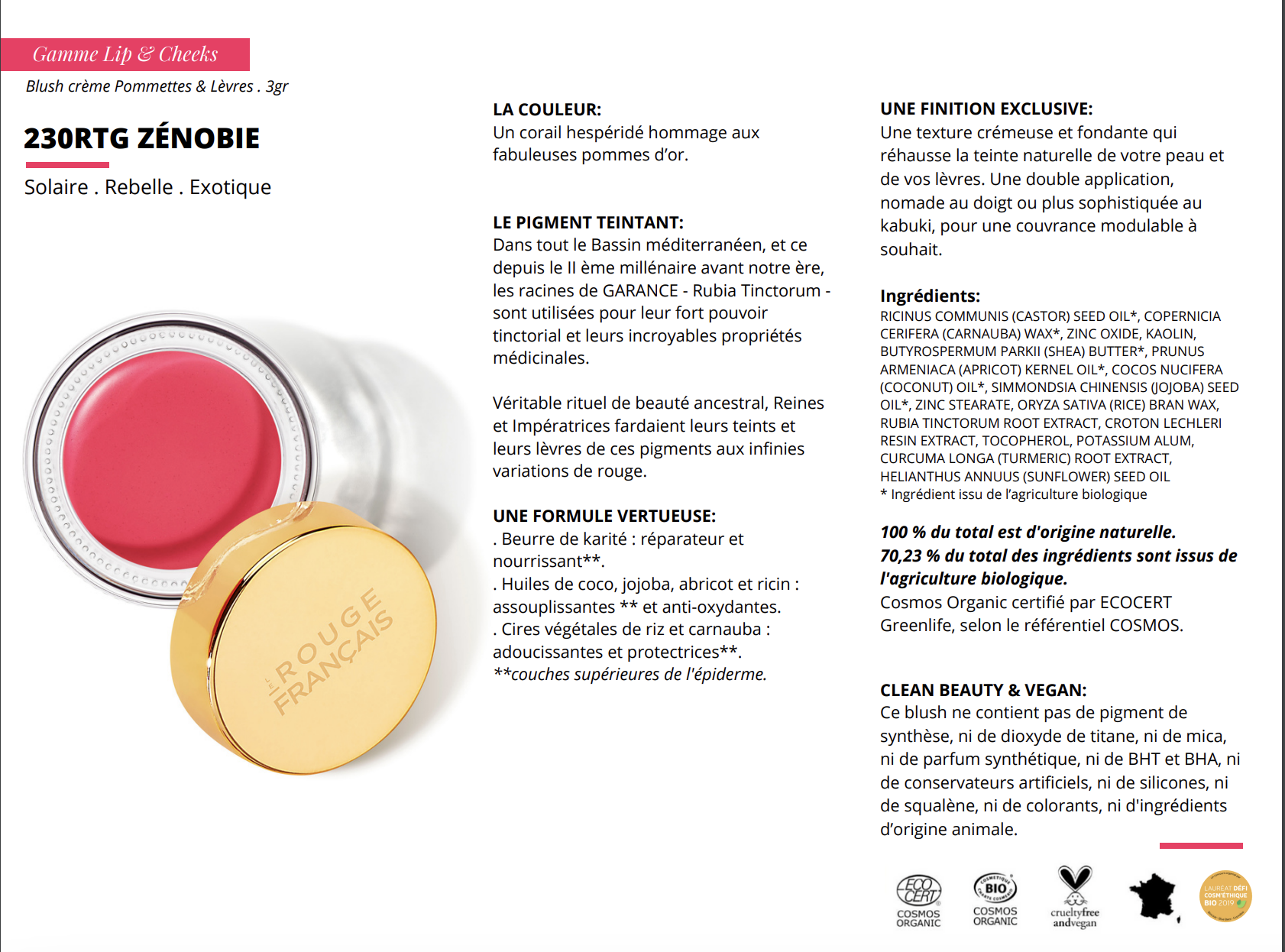 RICINUS COMMUNIS (CASTOR) SEED OIL*, COPERNICIA CERIFERA (CARNAUBA) WAX*, ZINC OXIDE, KAOLIN, BUTYROSPERMUM PARKII (SHEA) BUTTER*, PRUNUS ARMENIACA (APRICOT) KERNEL OIL*, COCOS NUCIFERA (COCONUT) OIL*, SIMMONDSIA CHINENSIS (JOJOBA) SEED OIL*, ZINC STEARATE, ORYZA SATIVA (RICE) BRAN WAX, RUBIA TINCTORUM ROOT EXTRACT, CROTON LECHLERI RESIN EXTRACT, TOCOPHEROL, POTASSIUM ALUM, CURCUMA LONGA (TURMERIC) ROOT EXTRACT, HELIANTHUS ANNUUS (SUNFLOWER) SEED OIL