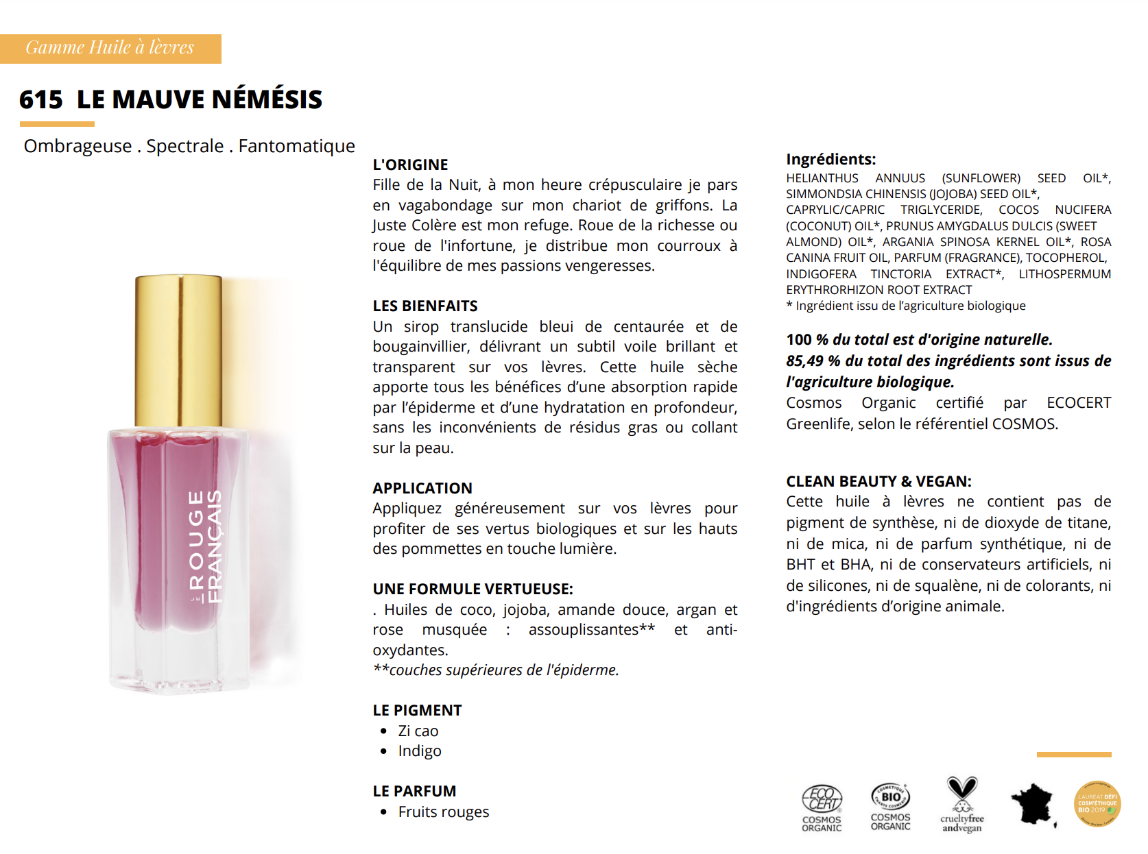 HELIANTHUS ANNUUS (SUNFLOWER) SEED OIL*, SIMMONDSIA CHINENSIS (JOJOBA) SEED OIL*, CAPRYLIC/CAPRIC TRIGLYCERIDE, COCOS NUCIFERA (COCONUT) OIL*, PRUNUS AMYGDALUS DULCIS (SWEET ALMOND) OIL*, ARGANIA SPINOSA KERNEL OIL*, ROSA CANINA FRUIT OIL, PARFUM (FRAGRANCE), TOCOPHEROL, INDIGOFERA TINCTORIA EXTRACT*, LITHOSPERMUM ERYTHRORHIZON ROOT EXTRACT