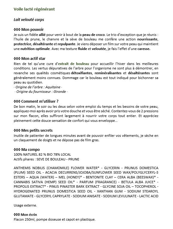 anthemis nobilis (chamomile) flower water* – glycerin – prunus domestica (plum) seed oil – acacia decurrens/jojoba/sunflower seed wax/polyglyceryl-3 esters – aqua (water) – mel (honey)* – bentonite clay – cera alba (beeswax)* – cannabis sativa (hemp) seed oil* – parfum (fragrance) – betula alba juice* – propolis extract* – pinus pinaster bark extract – glycine soja oil – tocopherol – hydrogenated prunus domestica seed oil – xanthan gum – sodium stearoyl glutamate – glyceryl caprylate – sodium anisate – sodium levulinate – lactic acid