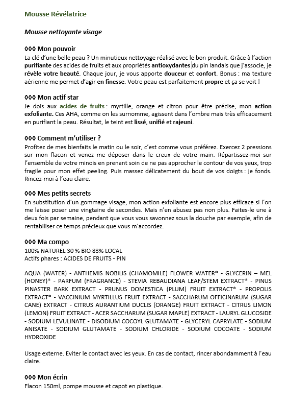 aqua (water) – anthemis nobilis (chamomile) flower water* – glycerin – mel (honey)* – parfum (fragrance) – stevia rebaudiana leaf/stem extract* – pinus pinaster bark extract – prunus domestica (plum) fruit extract* – propolis extract* – vaccinium myrtillus fruit extract – saccharum officinarum (sugar cane) extract – citrus aurantium duclis (orange) fruit extract – citrus limon (lemon) fruit extract – acer saccharum (sugar maple) extract – lauryl glucoside – sodium levulinate – disodium cocoyl glutamate – glyceryl caprylate – sodium anisate – sodium glutamate – sodium chloride – sodium cocoate – sodium hydroxide