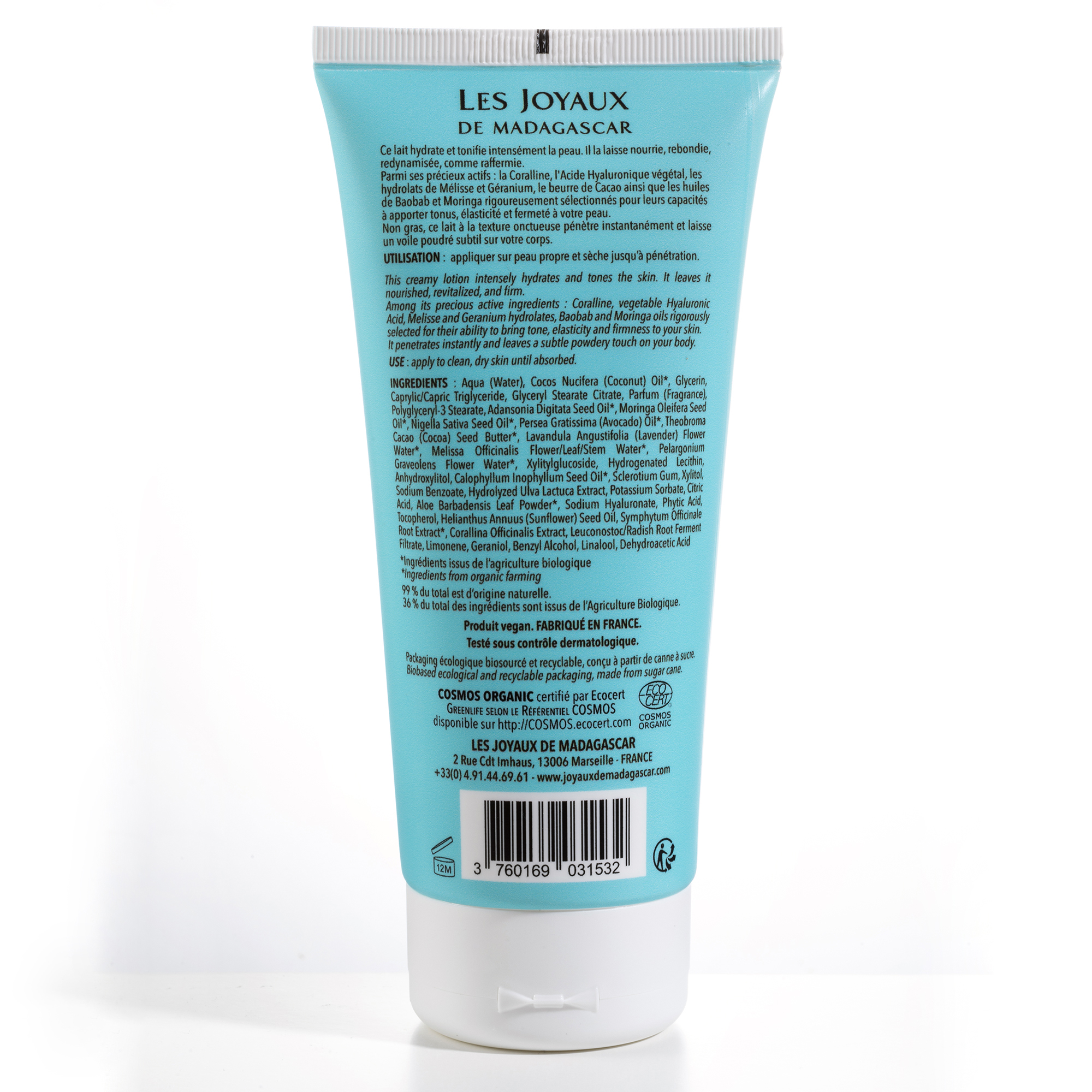 INGRÉDIENTS : Aqua (Water), Cocos Nucifera (Coconut) Oil*, Glycerin, Caprylic/Capric Triglyceride, Glyceryl Stearate Citrate, Parfum (Fragrance), Polyglyceryl-3 Stearate, Adansonia Digitata Seed Oil*, Moringa Oleifera Seed, Oil*, Nigella Sativa Seed Oil*, Persea Gratissima (Avocado) Oil*, Theobroma Cacao (Cocoa) Seed Butter*, Lavandula Angustifolia (Lavender) Flower Water*, Melissa Officinalis Flower/Leaf/Stem Water*, Pelargonium Graveolens Flower Water*, Xylitylglucoside, Hydrogenated Lecithin, Anhydroxylitol, Calophyllum Inophyllum Seed Oil*, Sclerotium Gum, Xylitol, Sodium Benzoate, Hydrolyzed Ulva Lactuca Extract, Potassium Sorbate, Citric Acid, Aloe Barbadensis Leaf Powder*, Sodium Hyaluronate, Phytic Acid, Tocopherol, Helianthus Annuus (Sunflower) Seed Oil, Symphytum Officinale Root Extract*, Corallina Officinalis Extract, Leuconostoc/Radish Root Ferment Filtrate, Limonene, Geraniol, Benzyl Alcohol, Linalool, Dehydroacetic Acid