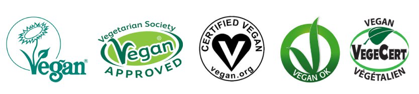 Some Varying Vegan Labels : Vegan Society, Vegan Approved, Vegan Awareness Foundation, VeganOK et Vegecert Vegan